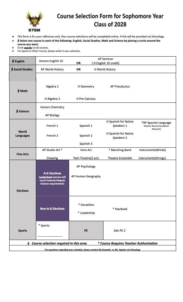 Magnet Class of 2028 Course Selection Sheet